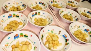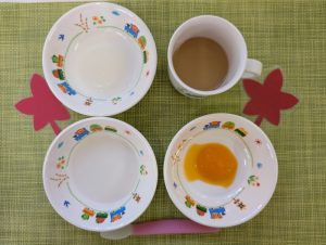 (写真は後期食です。月齢によって形、固さ、盛り付け量を変えて提供しています。