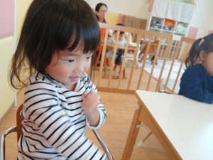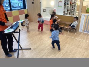 「さぁ、はじまるよ~🎵リトッミックしよう~🎵」とリトミックが始まる歌が始まると振付つきで、ノリノリで踊りだす姿がとっても