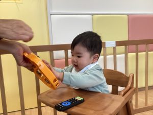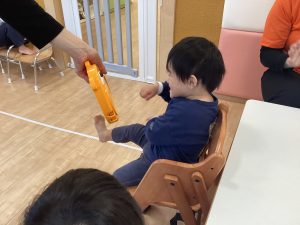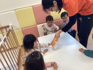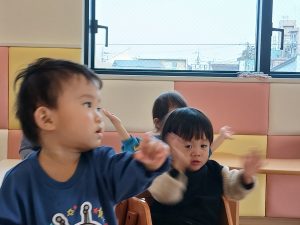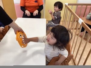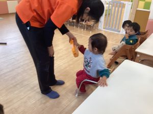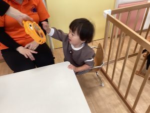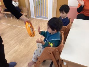 「○○ちゃん」とリズムに合わせて呼びかけると「はぁい」と3拍子でタンバリンをたたいてお返事してくれる姿もあるんですよ~🎵