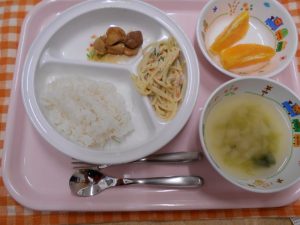 2019.05.20|給食ピックアップ 5月20日(月)給食 ★幼児食★ ◆ご飯 ◆みそ汁 ◆鶏肉のマーマレード焼き ◆スパゲッティサラダ ◆オレンジ ★離乳食★ ◆軟飯 ◆みそ汁 ◆鶏肉のマーマレード焼き ◆スティックきゅうり 前へ 次へ