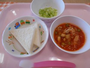 2019.05.29|給食ピックアップ 5月29日(水)給食 ★幼児食★ ◆食パン ◆わかめスープ ◆ポークビーンズ ◆ツナサラダ ★離乳食★後期★ ◆食パン ◆ポークビーンズ ◆茹でキャベツ 前へ 次へ