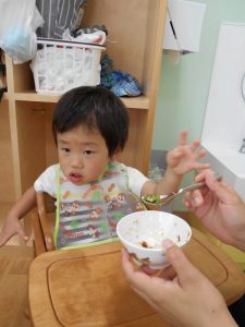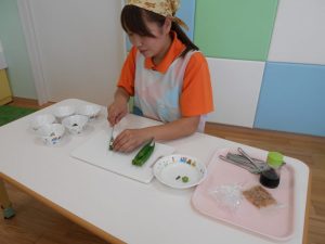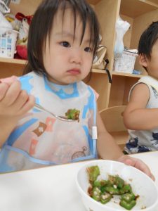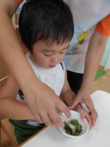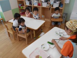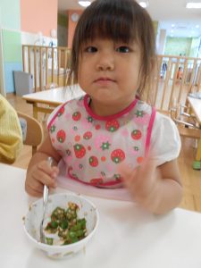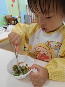 自分たちで育てた野菜??が花❀を咲かせ、実をつけ大きく育つ様子を目にしてきた子どもたちは大喜びでした。今回は混ぜるだけの簡単なものでしたが、今後の食育活動の取り組みも楽しみですね