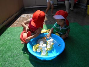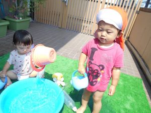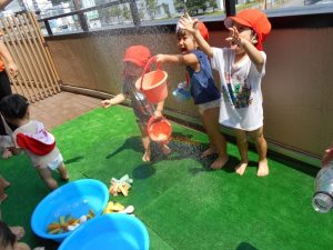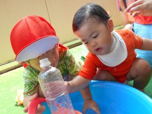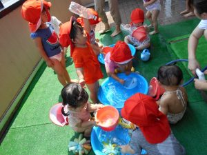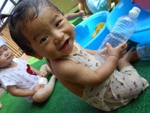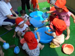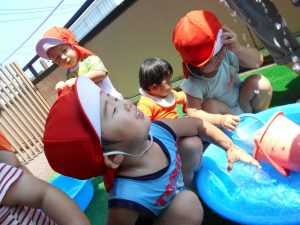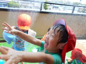 ギラギラ照り付ける太陽と共にやっと水遊びが満喫できる季節になりましたね君津園の子どもたちも???水遊びを大満喫しています。朝、先生が準備しているのを見て興味津々で『何が始まるのと毎日ドキドキわくわくがとまらないようですそれでは、今週も水遊びの様子をご覧ください。