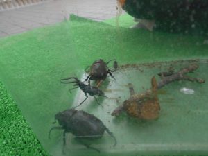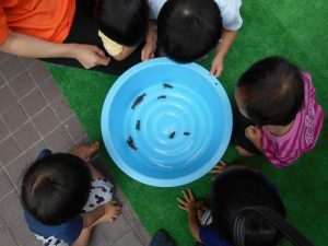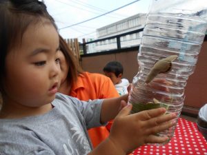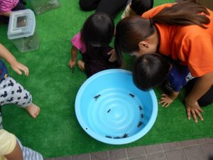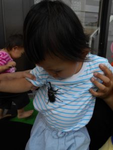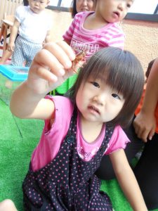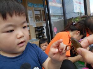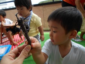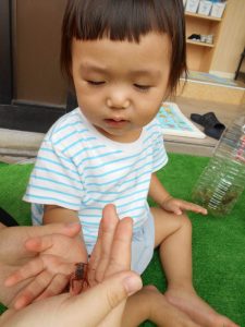 先生に生き物のお話をたくさん聞きながら触れ合いました。こんな機会はめったにないのでとても良い経験になったようです。子どもたちの虫への思いは強く40分程度集中して触れ合っていました。