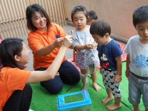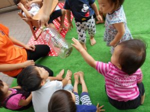 今日は最後の水遊びの日でしたがあいにくの雨でした残念そうにする子どもたちに寄り添うスタッフ・・・その姿にほっこりしてしまいました。さて、今週は子どもたちの楽しみにしていた夏祭りとお楽しみ会がありました。夏ならではの体験に大興奮でした。