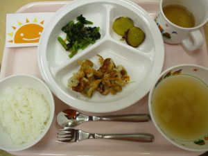 ご飯 味噌汁 大豆のかき揚げ さつま芋の甘煮 小松菜のおかか和え