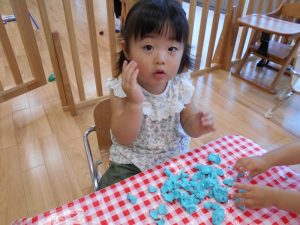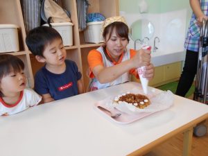 そして、おやつの時は先生がデコレーションケーキ?を作ってくれ大喜びの子どもたちでした。