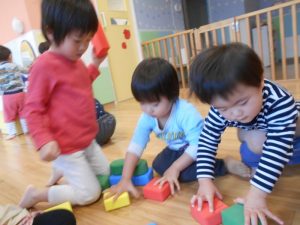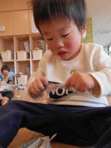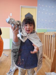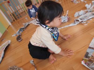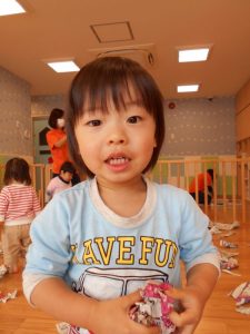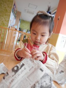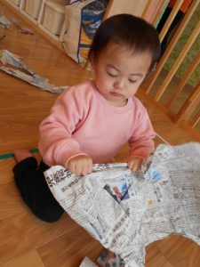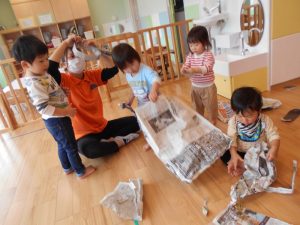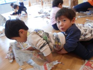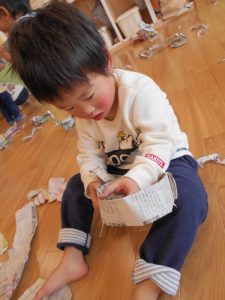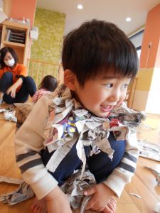 やぶく・折る・ちぎる・丸めると頭をフル回転させて、想像力を豊かにします。みんな個性あふれる作品を作り、そこからごっこ遊びがはじまり様々なやり取りが広がります。