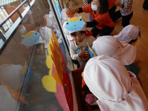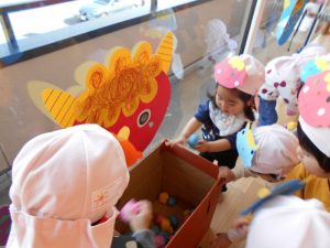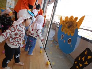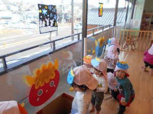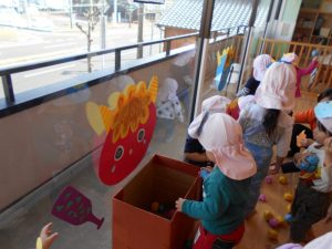 窓に飾ってある鬼にめがけてボールを投げて退治します![]()