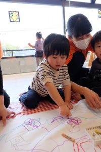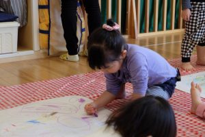 保育室の窓にはちびっこ画伯の作品が飾られました。