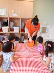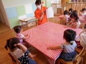 子どもたちも、楽しみの水遊びが出来ないことに、残念そうにしていました。そこで![]()