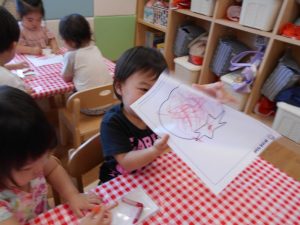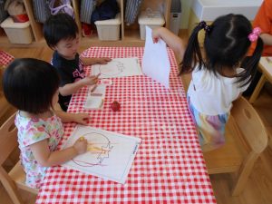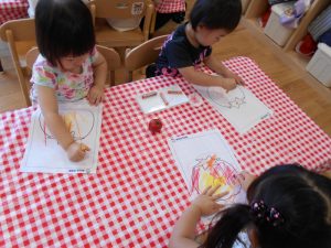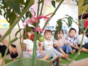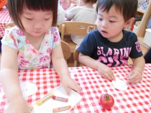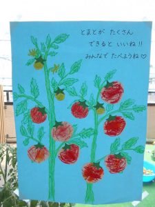 皆で観察しながら、願いをこめて赤いトマトを描き制作しました。