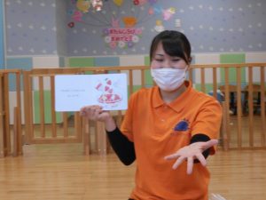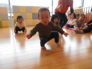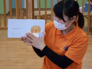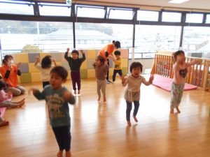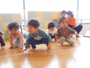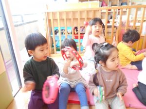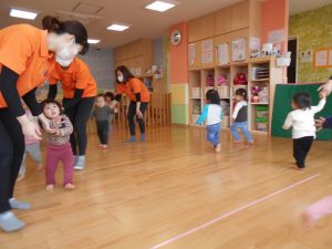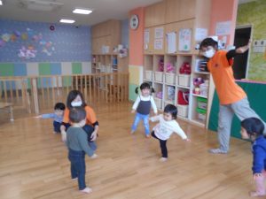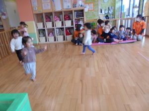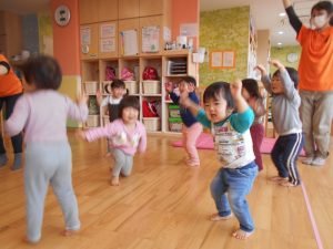 【おにのパンツ】【おもちゃのチャチャチャ】【線路は続くよどこまでも】【手をたたきましょう】リズム打ちを楽しみました。手拍子、マラカス、その他楽器を使いました。                          また、動物の模倣遊び。さくらんぼ体操の曲や園独自で用いている曲に合わせて動物の動きを楽しみました。