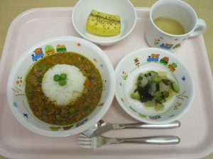 ※カレーは人気メニューですね♪おかわりもたくさんしてくれました!!大根サラダは、さっぱりとした甘酢の味で、苦手な子も多かった様ですが、頑張って食べていました。