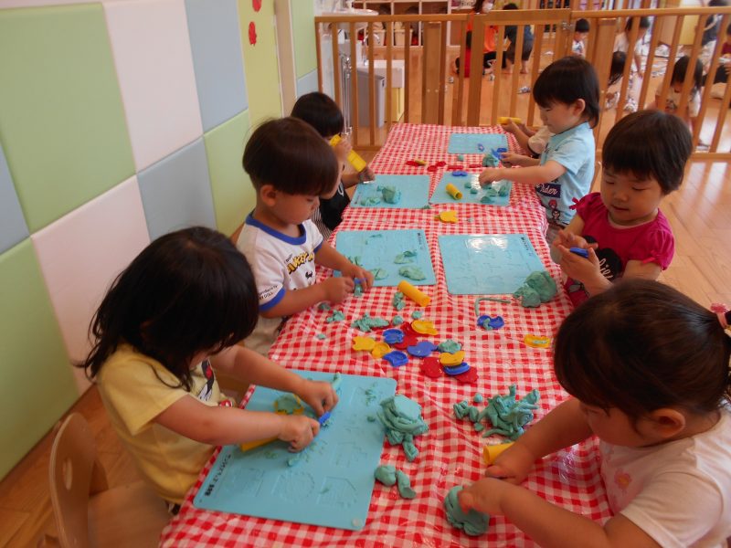 この日は2歳児は机上で粘土遊びを