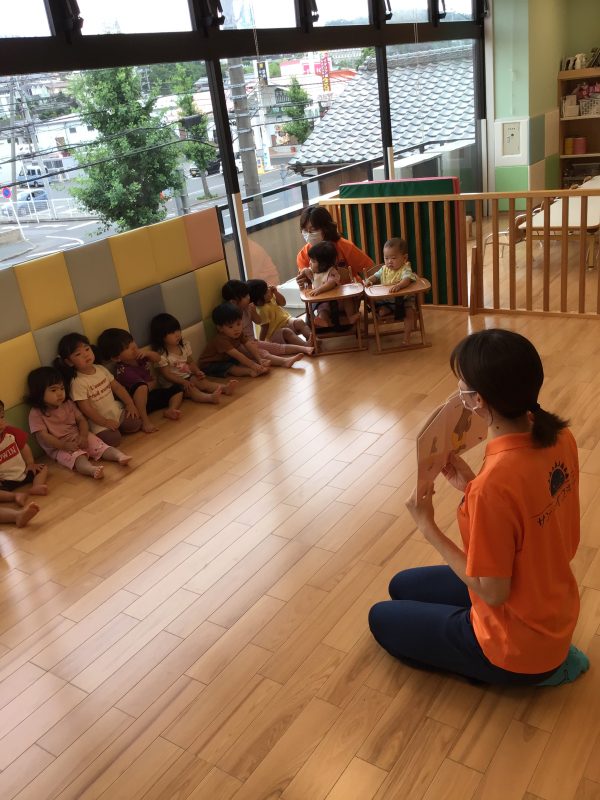 「こんにちは」と一緒に言いながら保育士と絵本を楽しみました。