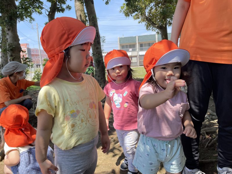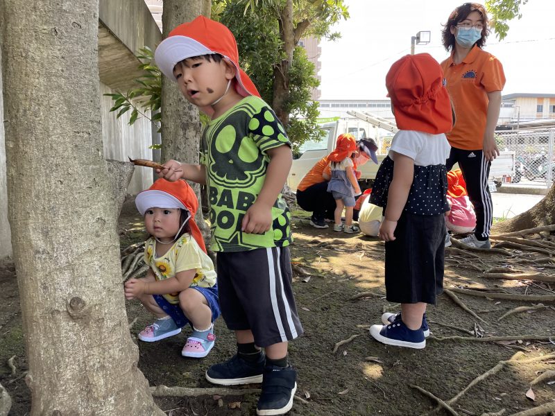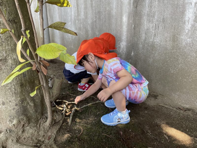早速アリの大群を見つけ「アリさんいた!」と大きな声で保育士に教えてくれるお友達(^0^)