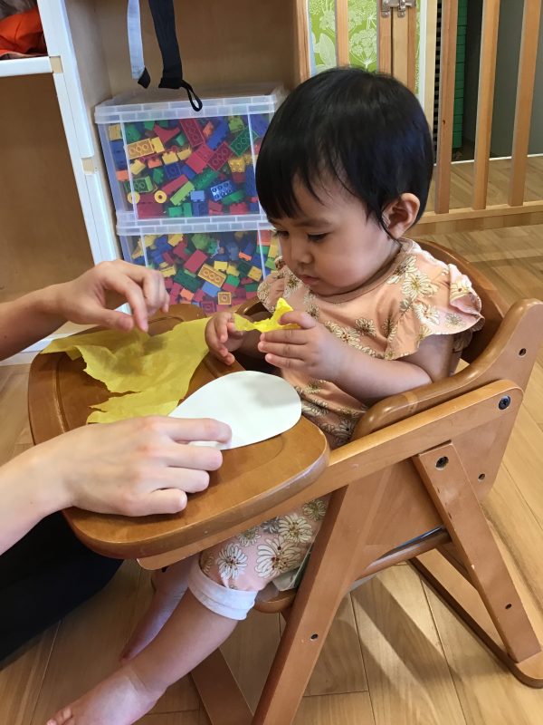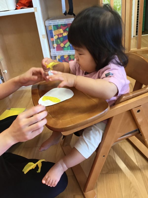 「あ!」と手に握ったおはな紙をポイと投げたりして遊びながら製作ができました?