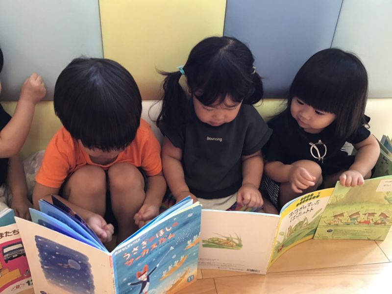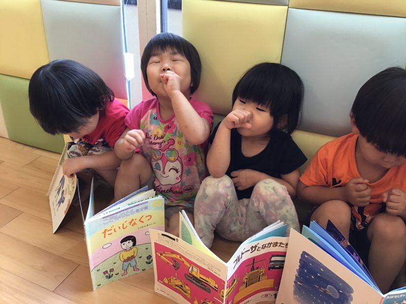 今度は場面がかわって活動の間に絵本を読むりんご組さんの様子です?