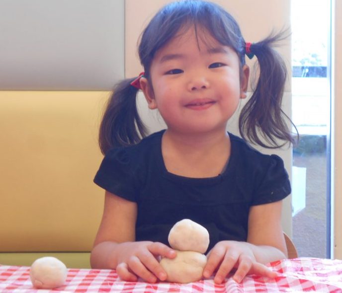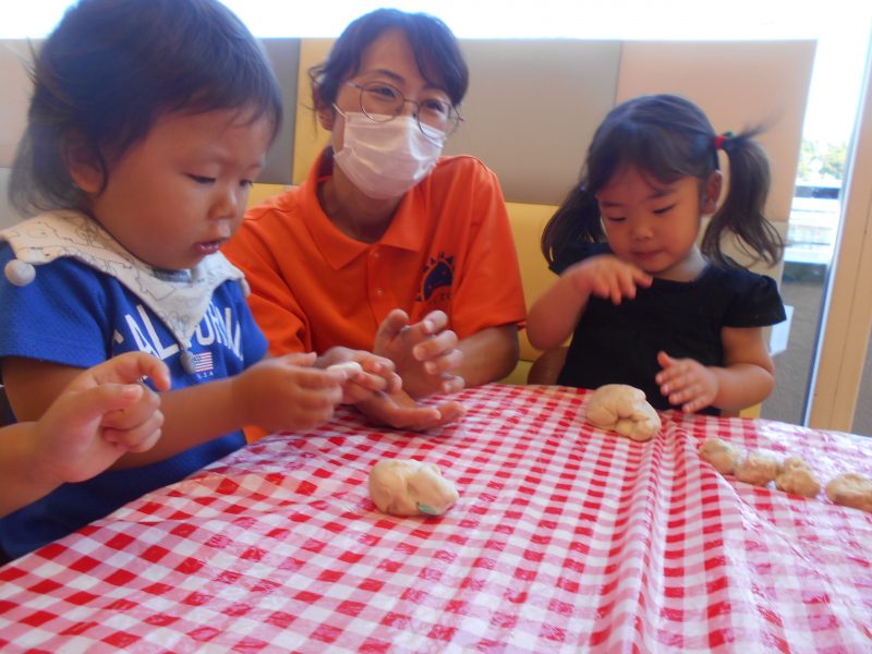 いつもは青色の油粘土で遊んでいるので、始めてみる白い粘土に興味津々の子どもたち。