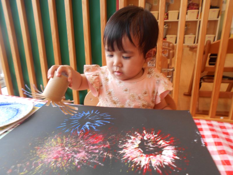 まずは、製作遊びで夏らしい花火スタンプを楽しむ子どもたち!