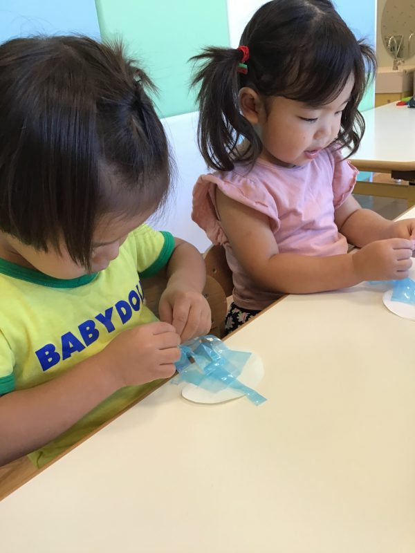 画用紙にすずらんテープをつけると、子ども達でテープを裂きくらげの足を作っていきました。