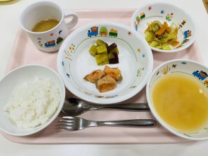 ご飯 味噌汁 鮭の照り焼き さつま芋の甘煮 野菜炒め
