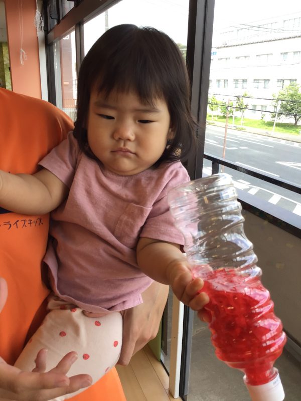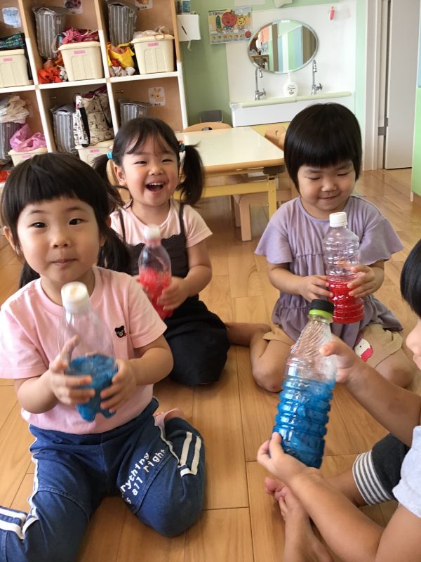 こちらは2歳児さんと一緒に遊んだジュース作り?お水と花紙を入れてフリフリしました。