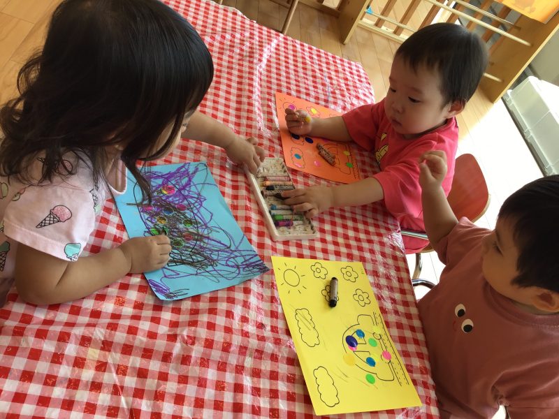 その後はクレヨンで色塗りする?と誘ってみると「かきかき?!」と嬉しそうにクレヨンを取ってぬりぬりしました?