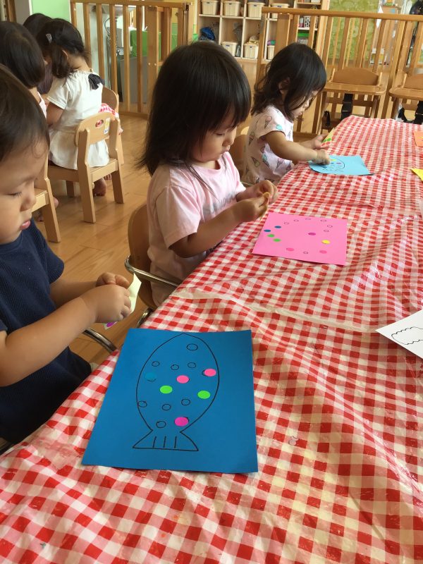 真剣な表情で、一枚一枚シールの色を変えて選ぶお友達や同じ場所に重ねて貼るお友達もいてとても素敵に仕上がりましたよ![]()