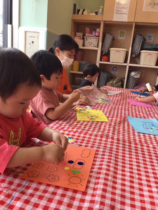 シール遊びは以前もやったことがありましたが、色紙と手描きの模様があると見栄えが全然違いますね✨いつのまにかシールを上手に剥がせるようになっていたり、◯に合わせてペタリと貼っていて保育者も驚きました!