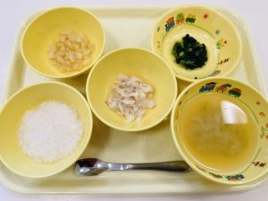 粥 味噌汁 煮魚 小松菜のおかか和え じゃが芋煮