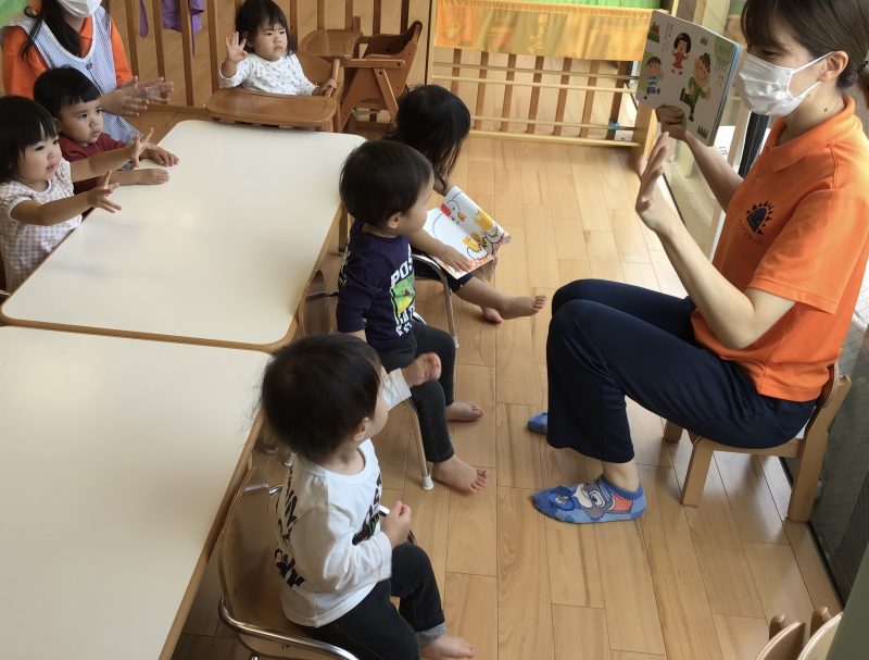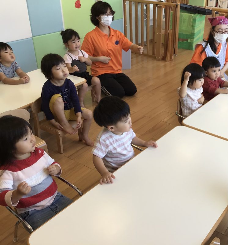 保育士が「グーチョキパーで♩」と歌い始めると子ども達も真似をして手を動かします?