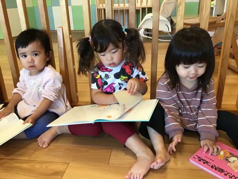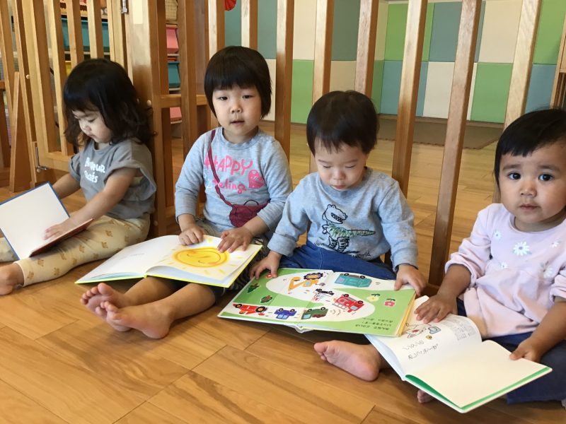 午後の活動で保護者の方のお迎えを待ちながら絵本を読んでいます?