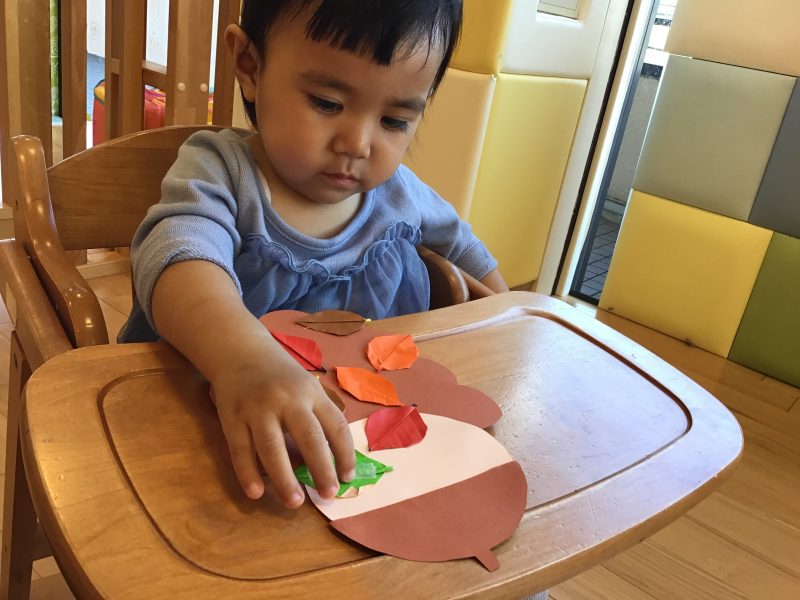先生特製の折り紙で作った葉っぱをペタペタ貼っていきます。