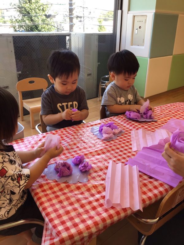 1歳児クラスのでは花紙を丸めて、両面テープを貼った台紙に