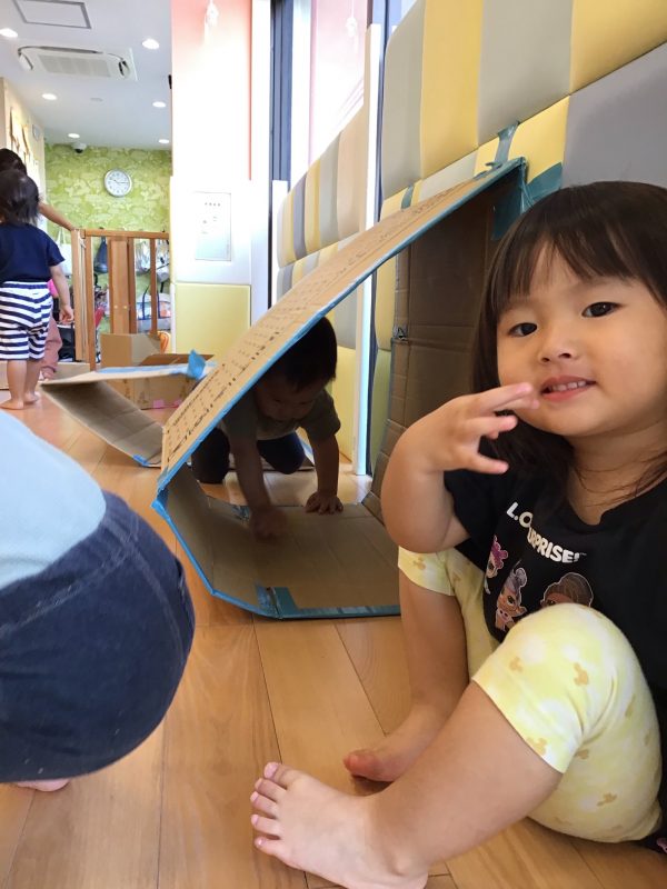 1歳児のいちご組さんは段ボールを電車やソリにして元気いっぱい身体をうごかして遊びました。