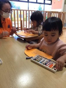 クレヨンを使って、さんかく帽子を作っていました♪クレヨンをそっと指先でもち、画用紙に向かって色が出るのをじっと見ながら楽しんでいましたよ?