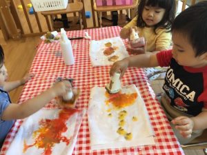 「あ、あか、いっぱい!!」と色とりどりの絵の具に興味を持っていました。この活動では『にじみ絵』を楽しんでいるようです?