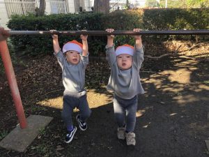 ブラーンとぶら下がるといい笑顔が見れました♪腕の力をいっぱい込めて、「すごいね!」と先生に褒められるとより一層がんばるパワーがみなぎっているようです。