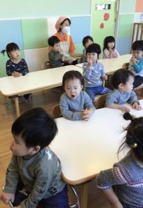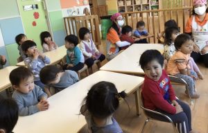 保育士と一緒に手をクルクルと回して「いとまき」の手遊びを楽しみました?