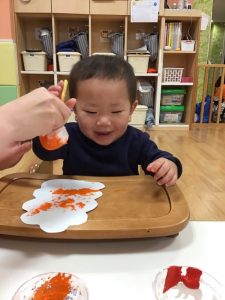 絵の具の感触にドキドキしながらもじーっと目を離さないお友達。。。
