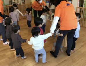 「make a circle」というお歌に合わせてみんなで輪になっておどります。何度かやるうちにお友達と手を繋いだり「big big」「small small」と先生の声に合わせ輪を広げたり縮めたりしています!!