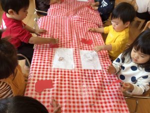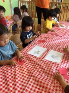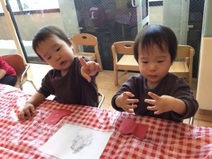 タンポ筆で絵の具をペタペタのせていきます。いい笑顔でパチリ?にぎにぎも上手にできるもも組さんです!