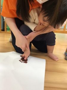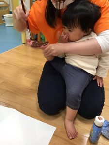 先生のおひざにしっかりと座り、上手に足形を取ることができました!これから何に変身するかお楽しみです?