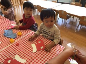 作り終えると長ぐつを手に持ち、先生と一緒に「シングルベール ジングルベール♫」と歌い始める子どもたち。なんだかぐんと冬が近づいてくる気がしました。