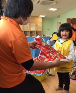 おもちゃが詰められたプレゼントを受け取る子どもたちのニコニコな表情を見ることができて、先生たちもうれしかったです?
