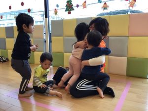 大興奮で先生のもとへダイブ??初めてにもかかわらず、言葉をまねて歌いはじめていましたよ。たくさんとお友達と楽しめる遊びを今後もたのしんでいきたいとおもいます?