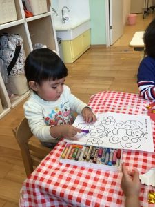 今週の0歳児クラスではお休みが多く、出席はひとりでした?が1歳児さんたちと一緒製作に参加してお絵かきを楽しみました♩「こっち!」と自分で席の場所を決めて1歳児さんたちとの時間を共有しました。もう一人前のお姉さんのよう?来年が楽しみです?