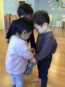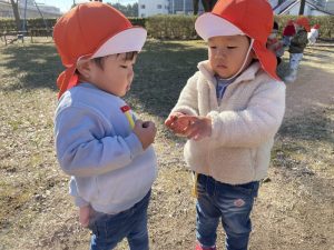 一緒にきたいちご組さんとどんぐりの見せ合いっこ?公園に落ちるどんぐりもほとんど無くなってしまいましたね。そんな中でもよ〜く目を凝らして見つけてくるのがさすが子どもたちですね✨
